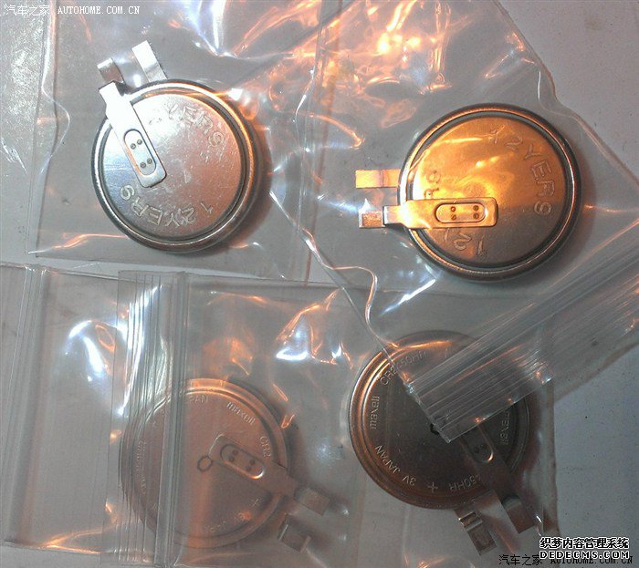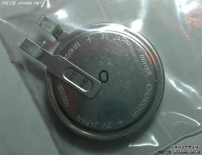 首先將舊電池拗下來,這個東西卡得很緊,位置又很局促,得十分小心操作。取下舊電池后一看型號CR2450,電壓3V。因手里沒有現成的電池,CR2450電池不常用,專程到電子城才買到,零售價7元左右一塊。但這個電池原裝時的方法是用熱風槍 拔焊臺 焊接等工具將接觸片焊住的,這樣不管怎樣震動都不得抖掉,一般2分鐘可以將電池焊好,待這次實驗成功后,另外3個傳感器的更換成本將大大降低。跟4S的1000大洋相比節省著不少,